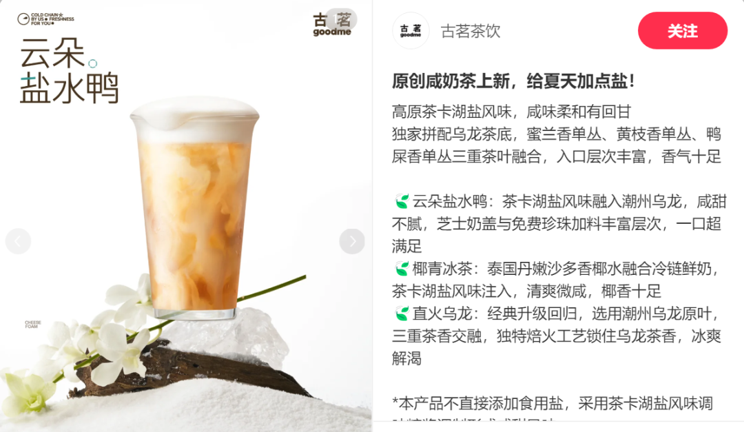 8月1日,古茗推出“原创咸奶茶”系列,将咸味元素引入茶饮领域。系列产品包括云朵盐水鸭、椰青冰茶和直火乌龙三款,均采用茶卡湖盐风味调味糖浆,打造“咸味柔和有回甘”的独特口感。