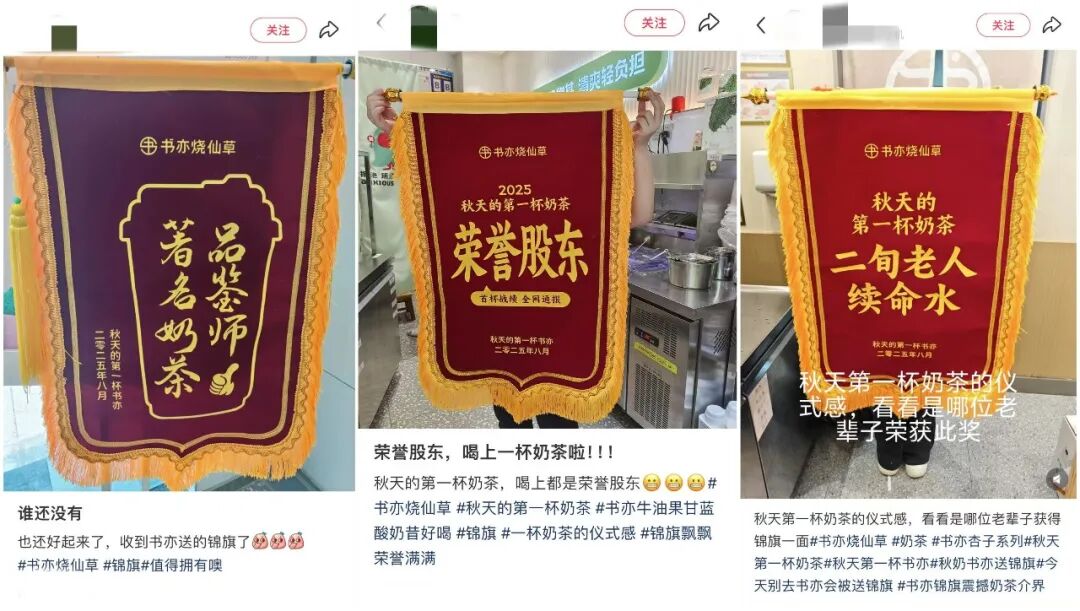 书亦烧仙草另辟蹊径玩起了“荣誉认证”,立秋当天,各门店的“001号”订单顾客,会直接收到一面“巨型秋奶锦旗”。